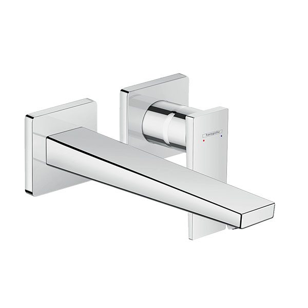 The technology in the concealed installation Metropol single lever basin tap with lever handle and 225 mm spout for wall mounting from hansgrohe disappears out of sight behind the wall. Its long spout is perfect for flat wash bowls and the design features an edgy shape and geometric silhouette. The mixer system can either be positioned on the left or right of the spout.