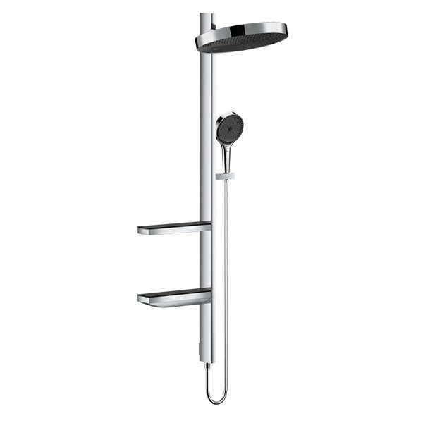 • Consists of: overhead shower, hand shower, shower holder, shower hose, 2 glass shelves, shower bar